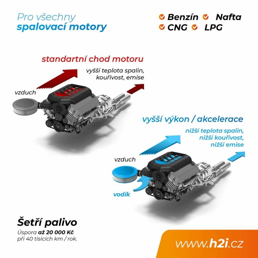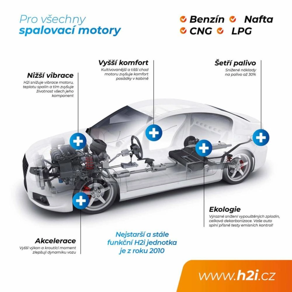 Přídavek vodíku zlepší spalovacím motorům jejich dynamiku, akceleraci a zajistí 100% funkčnost EGR ventilů, prodlouží životnost DPF filtrů a jejich regenerace. H2i uvolní veškeré staré úsady a pročistí vstřiky, ventily, písty a jejich pístní kroužky. Vy tak nebudete potřebovat různá aditiva do olejů, nebo paliv. Vodík motor oživí a navrátí mu ztracenou dynamiku, Vám radost z jízdy a minimální výdaje za servis. H2i ultimátně zvyšuje spolehlivost upravených motorů, spolu s tím výrazně snižuje jejich uhlíkovou stopu!,,H2i udělá z Vašeho vozu HYBRID. Motor je stále funkční na své stávající palivo, ale je s přídavkem vodíku, který motorům mění jejich dynamiku. I slabé motorizace dokáží s H2i potrápit i výrazně silnější vozy!